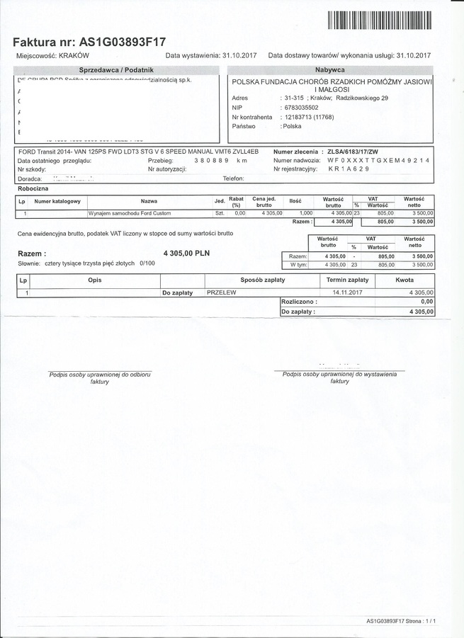 Jednak mamy również mieszane uczucia, bo z jednej strony radość i nadzieję, że jedziemy do Was nowym autem, jednak i ogromną obawę czy udźwigniemy to finansowo. Spójrzcie również na fakturę z serwisu za wynajem samochodu zastępczego. Nasza radość przepleciona smutkiem, oto jego oblicze: