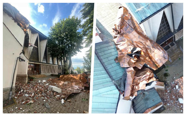 Druga burza, która uderzyła tydzień później, w niedzielę, 13 lipca, o godz. 16:00, dopełniła dzieła zniszczenia. Silny wiatr zerwał całe poszycie dachowe po obu stronach kościoła, a jego fragmenty runęły na ziemię. W tym czasie w świątyni przebywało blisko 500 wiernych, którzy zostali bezpiecznie ewakuowani. Skala zniszczeń jest ogromna – uszkodzona powierzchnia dachu obejmuje nawet 1600 m², a powyginana blacha wymagała całkowitego demontażu.