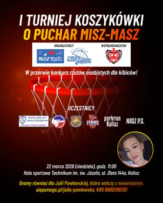 W niedzielę 22 marca po raz pierwszy rozegramy integracyjny turniej koszykówki o Puchar MISZ-MASZ. Spotykamy się, aby promować sportowy tryb życia ponad podziałami i aby pomóc Julii w walce z chorobą.