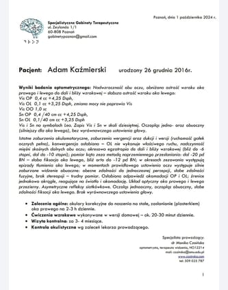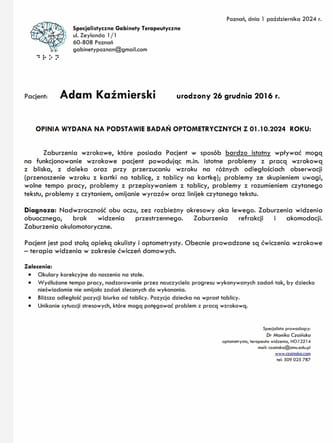 Dowiedzieliśmy się że lewe oko synka widzi jedynie w 10%.! Adaś potrzebuje zajęć z terapeutą specjalizującym się w ćwiczeniach wzroku tak zwana terapia widzenia. Pozostałe zajęcia rehabilitacja i zajęcia z terapeutami są bardzo drogie do tego wszystkiego dochodzi jeszcze koszt dojazdu do lekarzy którzy nie zawsze są w naszym miejscu zamieszkania. Bywają dni gdy jesteśmy bezsilni Chcemy pomóc synkowi ale mamy związane ręce koszty utrzymania leczenia Adama są bardzo wysokie. Dlatego prosimy państwa o wsparcie każda złotówka jest dla nas bardzo ważne zbliża nas do celu. Szesdziesiat minut terapii widzenia to 120 zł takich zajęć w tygodniu Adam musi mieć minimum 3 a nawet 4 . Na początek przez trzy miesiące potem kontrola u okulisty i u optometrysty zajmujący się leczeniem niedowidzenia u dzieci. Bardzo prosimy o wsparcie abyśmy mogli pomóc Adamowi odzyskać wzrok w lewym oku. Terapie widzenia możemy zacząć w połowie listopada do tego czasu Adam próbuje ćwiczyć w domu ale jest konieczna terapia widzenia U specjalisty nie tylko w domu przyniesie to dużo lepsze efekty zwłaszcza że czas ucieka i pogorszenie wzroku u Adama nastąpiło bardzo szybko .
