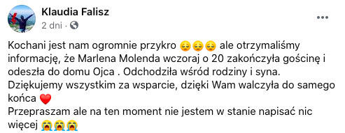 W sobotę otrzymaliśmy najtragiczniejszą informację. 11 grudnia o godzinie 20:00 Marlena odeszła od nas, pozostawiając rodzinę i synka.