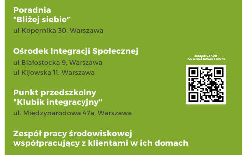 Prowadzimy Poradnię psychologiczną "Blizej siebie", Ośrodek Integracji Społecznej, Przedszkolny Klubik Integracyjny dla Dzieci z Autyzmem i Zespół Pracy Środowiskowej. W tych czterech miejscach pomagamy dzieciom i dorosłym osobom z Autyzmem i całościowymi zaburzeniami rozwojowymi. Naszą misją jest wspieranie samodzielności, rehabilitacji społecznej, pomoc osobom potrzebującym i ich rodzinom, a także edukacja środowiska osób, którym pomagamy.