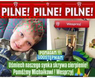 Uśmiech naszego synka skrywa cierpienie! Pomóżmy Michałkowi ! Wesprzyj 🙏 🩺💉Michałek cierpi na - Autyzm dziecięcy, choroby współwystępujące: niepełnosprawność intelektualna w stopniu lekkim, zespół nadpobudliwości psychoruchowej, zaburzenia integracji sensorycznej, padaczka, szpotawość stóp.....💔 Na pierwszy rzut oka Michał wygląda jak zwykły chłopiec – uśmiechnięty i radosny. Niestety, to, czego nie widać, to wyzwania, z jakimi każdego dnia musi się zmagać. Gdy miał 4 lata, lekarze stwierdzili u niego autyzm, ADHD i zaburzenia integracji sensorycznej. A to nie był koniec... Później pojawiły się kolejne diagnozy: padaczka i szpotawość stóp. Kiedy się o tym dowiedzieliśmy, było nam bardzo trudno. Nie wiedzieliśmy, dlaczego los napisał tak okrutny scenariusz dla naszego dziecka. Co takiego zrobił Michaś? 🆘 Synek ma trudności w nawiązywaniu relacji, nie rozumie typowych zachowań swoich rówieśników, jest też nadwrażliwy na bodźce. Padaczka odbiera mu radość z życia, a ostatni napad spowodował regres intelektualny. Michał przestał czytać, wymawiać dźwięczne głoski. Każdy atak to zagrożenie dla jego życia i rozwoju... Te wyzwania wymagają stałego wsparcia i kosztownej rehabilitacji, która pomaga synkowi się rozwijać i stawiać kolejne kroki ku lepszemu życiu. Michałek jest pod opieką wielu specjalistów, w tym m.in. psychiatry, neurologa, pulmonologa czy terapeuty integracji sensorycznej. Jako rodzice musimy zrobić wszystko, by dać naszemu synkowi szansę na lepsze jutro. Z całego serca dziękujemy, że nas w tym wsparliście, gdy po raz pierwszy poprosiliśmy Was o pomoc. Dzięki Wam mogliśmy walczyć o sprawność Michała! Jednak pomoc nadal jest potrzebna. Chcielibyśmy zapewnić Michałkowi specjalistyczny turnus rehabilitacyjny, ale jego koszt to ok. 12 tysięcy złotych. Co więcej, synek potrzebuje przynajmniej dwóch takich dwutygodniowych turnusów w roku, aby przynosiły jakiekolwiek rezultaty. Wierzymy, że razem z Wami uda się sprawić, że życie naszego dziecka będzie dla niego łatwiejsze. Każda wpłata, nawet ta najmniejsza, to wielka szansa. Szansa, że Michaś będzie mógł cieszyć się życiem w pełni, jak jego rówieśnicy... Dziękujemy Rodzice Michałka (otwiera nową kartę)